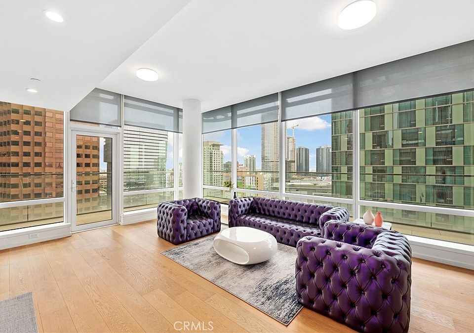 This two-bedroom / two bathroom home is a corner home capturing multi-directional, Located in the 19th floor with high ceiling, floor-to-ceiling windows with custom shades, desirable feature of a huge L shape sleek, glass private balcony , enjoy spectacular downtown city lights view , relax in your own outdoor oasis & soak up the warm sun, for lovers of watching Sunsets. Floor-to-ceiling windows with custom shades, a luxurious setting of relaxing. Kitchen features sleek Caesar stone countertops, Bathroom includes a custom-designed vanity and a soaking tub with stone surround. Central air conditioning and heating controlled by Nest Learning Thermostats. 7.5" oak plank flooring. Residents will be enjoy 24 hours lobby security services, Elevated resident-only amenities include over 1.7acres of indoor and outdoor amenities, from a heated outdoor pool and hot tub, billiards room and clubhouse, world-class fitness center with cycle/yoga room, business center, conference room, media room and game room, playground and dog park offers by Metropolis. Hotel Indigo is right next to the building. Easy access to the 110, 101, and 5 fwy.