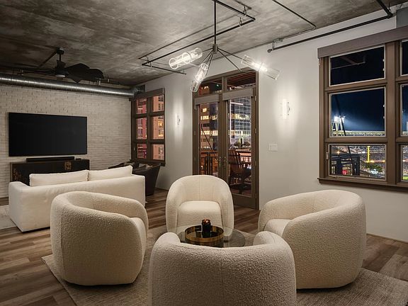 Waterfall-edge quartz countertopsSerene landscaped courtyardDramatic custom lighting installationsBespoke cabinetryExposed ductworkPanoramic ballpark viewsThermador appliances