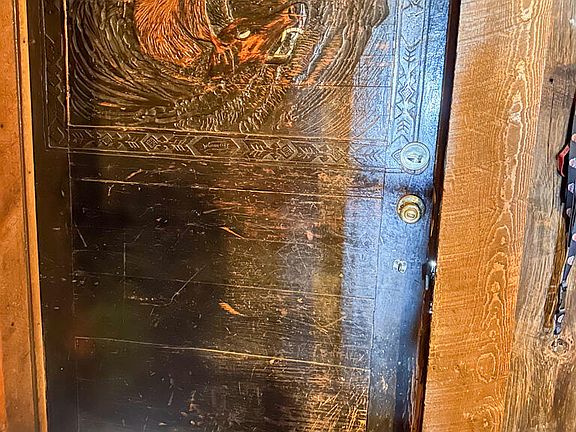 Carved wooden beamsOriginal bar topPerformance stageExcellent frontageRock fire pit