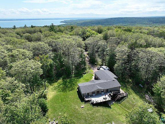 This home in the woods, at the top of the hill in Washburn, is a special place! Surrounded by 5 lovely wooded acres with large oaks and pines, and adjacent to the School Forest's 40 acres. Thoughtful modern layout with a great master bedroom/bath at one end of the home, and two bedrooms and a full bath at the other. Spacious kitchen, formal dining rm, inviting living rm, main floor laundry, and a great office round out the main level. Lower level is setup as a mother-in-law suite and has been used as a rental in the past. Unfinished 14'x70' lower level room is waiting for your ideas! Heated 3 car garage has workbenches and 10.5' high ceilings. Large deck out back overlooks the yard and woods.