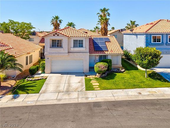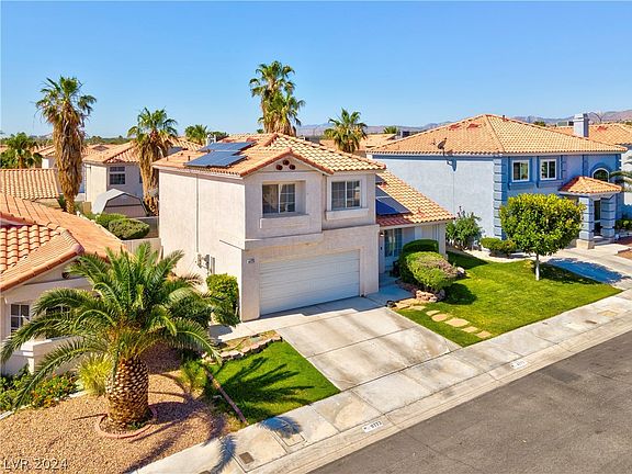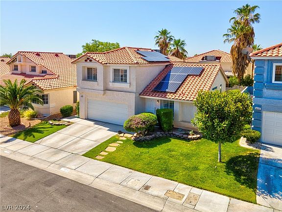 Gorgeous two story gem located in the beautiful north west Las Vegas valley. This 3 bed/3 bathroom homes features an open concept floor plan, sparkling man made wood flooring downstairs, brand new carpet throughout upstairs, and fresh interior paint. The sunken living room is great for any use. The kitchen is spacious and highly functional due to the incredible layout. Bright green lawns in both front and back add to the allure. Slip into paradise with a relaxing spa in the backyard! Home is solar powered. Welcome home!