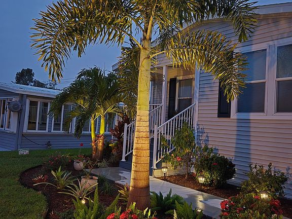 Absolutely gorgeous! LOCATED ON AN EXTRA LRG PERIMETER LOT! 2023 3 bed 2 bath 1326 sq.ft. Palm Harbor located in Countryside at Vero Beach 55+ community. Lot rent will be $1028 for any new owner and includes the use of the parks wonderful amenities, basic lawn and trash service. Amenities include a refreshing pool, billiards, tennis/pickleball and shuffleboard to name a few. Boasting a wide-open floor plan, vaulted ceilings and tons of natural light make a noticeable impression. The kitchen is stunning. From the beautiful gray cabinetry, to the apron sink and energy efficient stainless steel appliances this will be the heart of the home for sure! There is also a breakfast bar in addition to the spanning kitchen island that provides ample seating for entertaining. Let's not forget to mention the crown molding, cornice boxes and recessed lighting bring more of an upscale feel. The entire floorplan flows wonderfully from the spacious living area to the kitchen and dining. Great for entertaining! Vinyl plank runs throughout the home with the exception of the carpeted bedrooms. The main bedroom has its own hallway entrance, walk-in closet and a gorgeous en suite bath with double sinks, a walk-in shower and a beautiful modern tile backsplash. The home is a split floorplan and has 2 guest rooms and a spare bathroom for your company to enjoy. Equipped with a laundry room that also has a small pantry and upper cabinets. The front porch draws you in for either a morning cup of coffee or an evening sangria - either way it's the place to be. There is also a quiet back patio overlooking the extra-large back yard. The driveway is HUGE - large enough for 3 vehicles and a golf cart. Call today to schedule a showing or make an offer! Countryside is a 55+ community that sits just minutes from I-95 and most shopping needs. Just 20 minutes to the closest beach. Must be park approved with background and credit check to purchase home. All listing information is deemed reliable but not guaranteed and should be independently verified through personal inspection by appropriate professionals. Our company does not and cannot guarantee or warrant the accuracy of this information or condition of this property. Measurements are approximate. The buyer assumes full responsibility for obtaining all current rates of lot rent, fees, and pass-on costs. Additionally, the buyer is responsible for obtaining all rules, regulations, pet policies, etc., associated with the community, park, or home from the community/park manager. Our company is not responsible for quoting said fees or policies.
