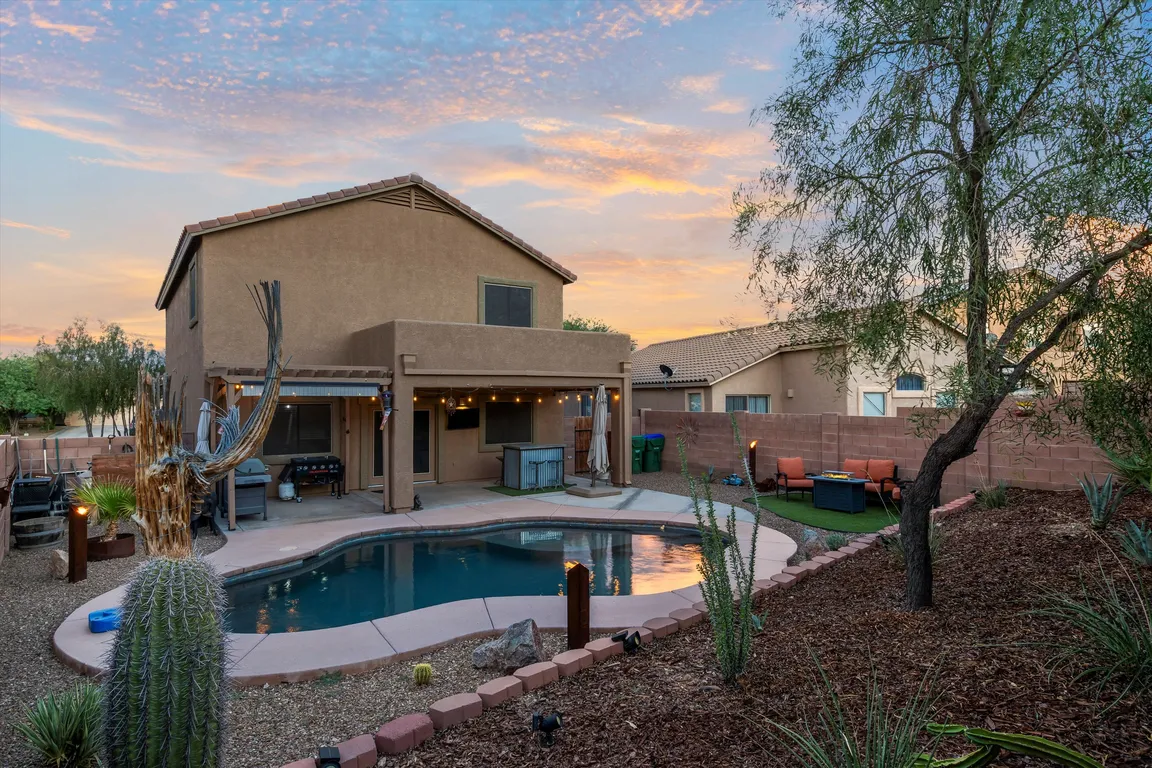 Stunning Loft-style plus Den floor plan in Tucson's Northwest area of Continental Reserve. Walking trails abound. Views of Sombrero Peak from your resort-like backyard. Cul-de-sac lot for ultimate serenity away from cross-through traffic in the neighborhood. POOL with lagoon entry and umbrella slot for relaxation and shade. Fully landscaped backyard has ...