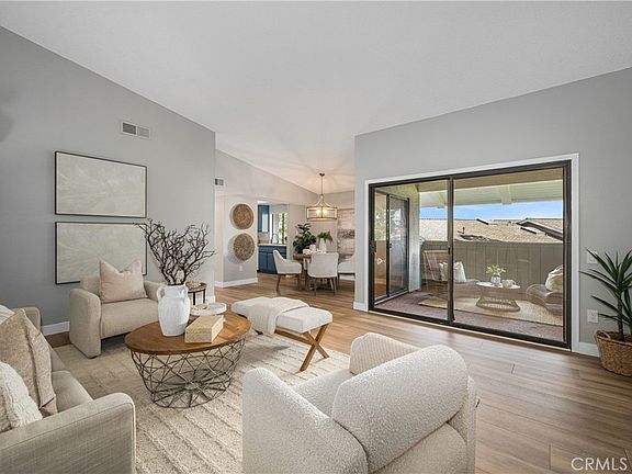 Upper level 2 bedroom, 2 bath condo in the desirable 55 plus Landmark community offering 1056 square feet of comfortable living in a quiet, park like setting minutes from the ocean. This home features vaulted ceilings and large sliding glass doors that open to a private deck, bringing in an open and airy feel with views of Saddleback and ocean breezes. Additional highlights include private laundry and a single car garage, plus ample guest parking. The primary suite includes its own bath and generous closet space, and the second bedroom works well for guests or a home office. Landmark is a guard-gated community known for its vibrant, active lifestyle with resort-style amenities such as a pool, hot tub, fitness center, tennis and pickleball courts, an expansive putting green, horseshoe pits, clubhouse, walking paths and greenbelts, BBQ areas, RV parking and indoor activity rooms including billiards, ping pong, arts and crafts, and a well-equipped woodshop. Conveniently located close to shopping, dining, the HB Senior Center, and the beach.