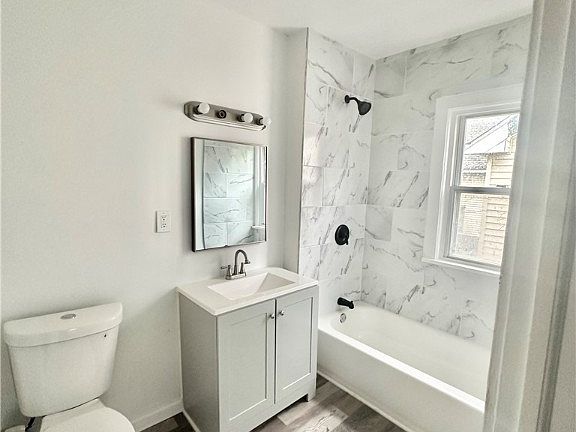 Lovely and affordable and updated 3 bedroom colonial. Beautiful serene decor with luxury vinyl tile flooring throughout. White kitchen cabinetry with gorgeous countertops. Marble tiled surround in the bathroom. Newer carpet in all bedrooms. Spacious 3rd bedroom on third level. Contemporary ceiling fans and light fixtures throughout. Glass block windows and security doors. Newer furnace, hot water tank and updated electrical. Fenced in yard and ample space for entertaining.