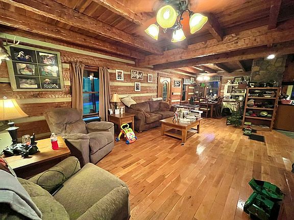 Log Home with 7 acres of pasture and log. Range views and no other neighbors in sight. Sit on the front porch and watch the sunsets. Quiet paved road with minimal traffic. Less than 5 min to New River Trail and New River and very close to horsetrails. Open kitchen, dining, living. Kitchen has quartz countertops, stone backsplash, and ceramic tile. Dining has a functional rock fireplace and hard wood floor that extend to the living and hallway leading to the bathroom. Bathroom is farmhouse style with ceramic tile, shower/tub combo with bronze fixtures and super cute sink with built in shelving. Upstairs there's 3 bedrooms and the laundry room which is already plumbed in for another 1/2 bath. There's another access off the primary bedroom that could be easily converted to a walk in closet. Newer metal roof. Bring the horses or cows, or whatever you want with this mini-farm. Woodstove in the full basement with in/outside access. Outside enclosed shed building for great storage space.