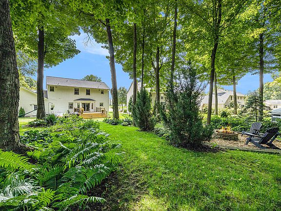 It would be tempting to pause your showing at the inviting front porch overlooking a beautiful perennial garden but continue in and you'll be charmed by a the updated interior featuring, new flooring, a cozy fireplace with stonework and shiplap details, and large kitchen equipped with sleek black stainless steel appliances and oversized pantry cabinets. A renovated laundry with barn door, renovated guest bath, and large office round out the first floor. Before we head upstairs - wow - imagine Michigan Summer nights in that park-like backyard! New 16x16 deck with lighted stairs, custom fire pit, surrounded by mature trees that offer shade and privacy making it the perfect place for gatherings or hanging out with a good book!
