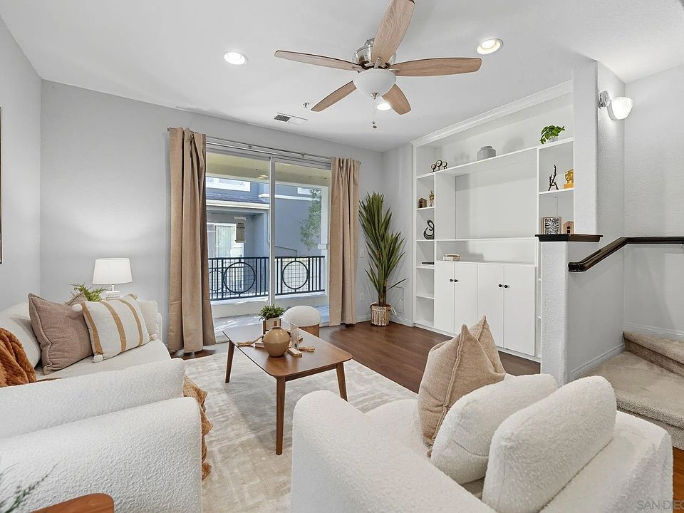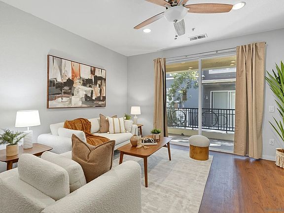Discover modern living and ultimate convenience in this exceptional 4-bedroom, 3.5-bathroom Kearny Mesa townhome. The inviting living room, complete with a built-in entertainment center, provides a perfect hub for relaxation and gatherings. Its versatile three-story layout features three bedrooms with private en-suite baths, including a secluded first-floor suite ideal for guests or a home office. Just across the street the beautiful Centrum Park offers a playground, two gated dog parks, and expansive green lawns for recreation. A rare side-by-side two-car garage provides premium parking, another standout feature for the unit. With easy access to major freeways and the vibrant dining of Kearny Mesa, this home truly blends comfort, design, and an unbeatable location.