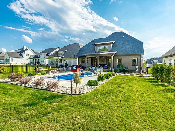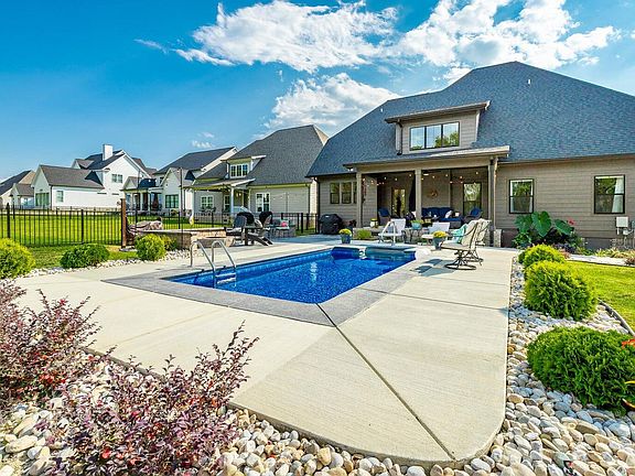 and a low maintenance in-ground pool and patio retreat. The interior is furnished with hardwood floors, specialty ceilings, formal dining room, granite countertops, large 2-story great