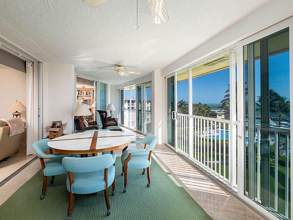 This 4 bedroom 3 bath top floor unit has the best views in Ocean Harbor AND a 50 ft. boat slip! Enjoy starting your day with a cup of coffee and breakfast on the ocean facing terrace and finish the day with the impact doors open and enjoying the cool breeze. Upon entering the condo you can look straight out at the ocean and the protected marina where the 50 ft. slip awaits your vessel. The primary bedroom has beautiful ocean views and has direct access to the terrace. Two guest bedrooms are to the right with a large guest bath and HUGE shower. A separate laundry room is adjacent with a clever laundry chute from the primary closet. The dining area is defined with a coffered ceiling with 2 skylights and a beautiful chandelier. The 4th bedroom is adjacent to the 2nd guest bath and has direct access to the oceanfront terrace. This offering includes 50 ft. slip #3 which currently has a 3,000 lb. Sunstream Sunlift for a smaller vessel. 4 Post boat lifts are permitted should you have a larger vessel that you want to keep out of the water. A large dockbox is available for additional storage.