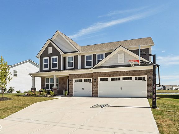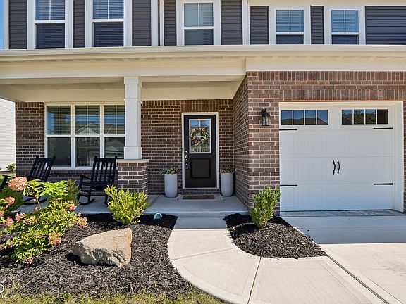 This nearly new 5-bedroom, 3.5-bathroom home features an open concept layout and is situated on a quiet pond lot with no neighbors directly behind you! A relaxing covered porch welcomes you into a spacious main level that includes an office with French doors, a main-level 5th bedroom suite with an ensuite full bath, a large living room with a centerpiece gas fireplace and a huge kitchen featuring upgraded white cabinets, SS appliances, quartz counters, an island with seating for 4, a huge walk-in pantry and added cabinets that create a serving/buffet area. Upstairs boasts a spacious loft area, a convenient 2nd floor laundry and 4 large bedrooms, including the primary suite with pond views, tray ceiling, ensuite bath with oversized shower, dual sink vanity and massive walk-in closet. Outside, enjoy the concrete patio that overlooks a spacious backyard and serene pond. The 3-car garage provides ample storage and convenience. Community amenities include a pool, pool house, playground, walking trails and ponds. With quick and convenient access to I-69, indulge in shopping and dining at Hamilton Town Center, explore Falls Park in historic downtown Pendleton or catch a concert at Ruoff Music Center, all only minutes away.