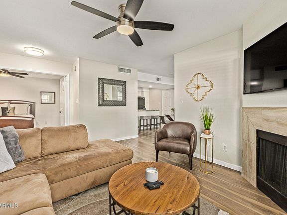 This charming remodeled, fully furnished 2-bedroom, 2-bath condo awaits you in the desirable McCormick Ranch! The thoughtful renovation now offers two primary bedrooms, each with its own bathroom, providing comfort and flexibility for guests or multi-generational living. Explore the bright interior, showcasing wood-look flooring, a welcoming fireplace, and a soothing palette that creates a cozy ambiance throughout. Whip up your signature dishes in the impeccable kitchen, equipped with ample cabinetry, a tile backsplash, a granite peninsula, and built-in essentials. Each primary retreat promises restful nights, with one featuring double sinks and a spacious closet. Step outside to enjoy your morning brew under the cozy covered patio. The amazing location places you near the mall, a beautiful greenbelt perfect for walks, and nearby parks. Don't forget to visit the community's pool, spa, clubhouse, and other amenities for a relaxing time. This fully furnished home is a must-see!