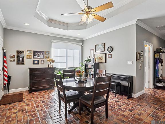 Resort-style living awaits in the beautiful Easterly Lakes community—known for its peaceful surroundings, spacious lots, and convenience to Live Oak area schools. This French-style home combines Louisiana charm with thoughtful updates and versatile living options on nearly half an acre backing to open pasture. Inside, an open floor plan with no carpet highlights wood, ceramic, and brick floors throughout. The kitchen features a new Thermador gas cooktop and oven plus a Frigidaire microwave, while the primary suite offers a walk-in closet, jetted tub, separate shower, and updated Delta thermostatic fixture. Recent upgrades include two new HVAC systems, mini-split units for the garage and sunroom, dual tankless water heaters, a whole-house generator, keyless entry, Ring security, and a converted insulated garage with added outlets. The laundry room accommodates a full-size freezer or refrigerator, and the partially floored attic provides lighted storage. Enjoy year-round comfort in the 600-sq-ft climate-controlled sunroom overlooking the saltwater pool, plus a 15 × 23 ft heated and cooled flex room—perfect for a gym, studio, or playroom. A climate-controlled RV-height workshop/garage with sink, cabinetry, and refrigerator adds even more space for hobbies or storage.