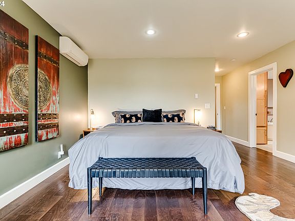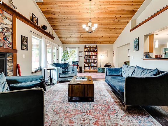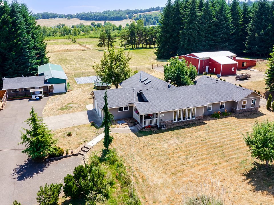 Experience the charm of close-in country living with this ideal hobby farm! Situated on a level 5-acre lot, this property features a beautifully remodeled, single-level home. Spacious great room with a central soapstone fireplace, complemented by an elegant kitchen and dining area. The kitchen includes ample cabinetry, an island with an eating bar & stainless steel appliances. Engineered hardwood floors throughout the home, including the living room which features wood plank vaulted ceilings, fireplace & French doors leading to a covered deck. Both bathrooms are tastefully updated, with wood slab & granite counters, tile showers & a luxurious soaking tub in the primary. The primary bedroom has a generous walk-in closet accessible from the adjacent fourth bedroom. The property offers a variety of outbuildings: a versatile shop, an art studio space with storage above, a canning kitchen (formerly a ceramics studio) & custom chicken coop. The substantial, insulated & heated barn/shop is equipped with a compressor, 1-ton hoist, an exhausted paint room, air hoses & generator with many tools, hay storage & much more. Sediment filter on well. Five apple trees, as well as 50 blueberry bushes & garden, both with irrigation. Cozy wooded area with a beautiful fire pit among more than 100 Douglas Fir trees provides a magical setting to host friends & family. 2.5 acres set to pasture, producing hay. A must-see for those seeking a serene country lifestyle.