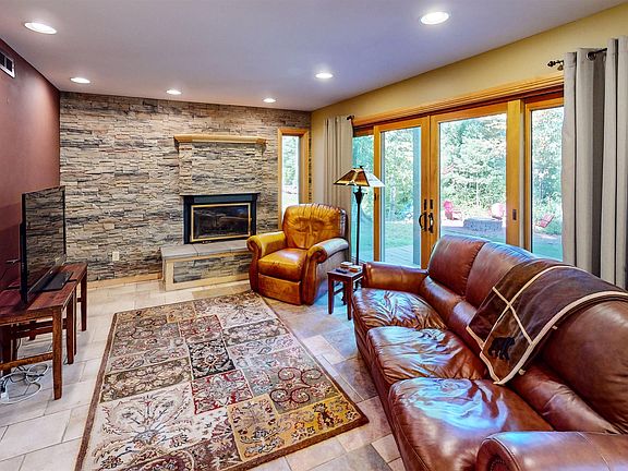 - Description: Wood-burning stone fireplace, doors to the patio and backyard.