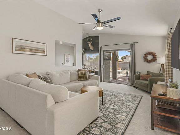 This 3-bedroom, 2-bath single-story blends comfort with thoughtful style. The open living room features vaulted ceilings, large windows, and sliding glass doors that fill the home with natural light. The kitchen offers plenty of cabinet space and a clean layout that makes cooking a breeze. The primary suite feels like a retreat with its accent wall, updated lighting, and spacious ensuite bath with dual sinks, soaking tub, and separate shower. Secondary bedrooms are versatile; perfect for guests, kids, or a home office. Both bathrooms feature tasteful updates, including bold paint accents and modern fixtures. A dedicated laundry room, neutral paint, and stylish touches throughout make this home truly move-in ready. Out back, enjoy a covered patio and newly completed landscaping in the private yard with no homes directly behind for extra peace and quiet. Move-in ready and thoughtfully updated, this home is just the one you've been waiting for!