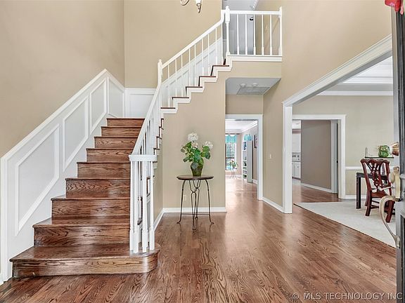 Why go on vacation when you can live at a resort?  Entering the front door, you will find gorgeous hardwood floors throughout the downstairs.  Downstairs office has a trayed ceiling, built in shelves and a closet.  The downstairs master suite has coffered ceilings and a view of the stunning backyard.  Master bath has been updated, complete with a regular shower head, a rain head, and wall jets.  Updated kitchen with so much storage, pull out drawers, double ovens, and plenty of counter space.  Upstairs you will find all new carpet with expensive padding, updated bathrooms including new floors, shower tile, and faucets.  All bedroom closets are walk in.  Massive game room upstairs with built in shelves and a wet bar.  Outside the resort living begins!  Stamped and stained concrete patio, wood burning fireplace, gas grill, two burners, a sink, a fridge, a bar, a TV, outdoor seating.  Professional landscaped with a walking path through the gorgeous perennials.  Two covered patios, decorative lighting, a fire pit, separate master bedroom patio with sitting area and TV mount.  Gunite pool with waterfall that was resurfaced in 2021.  50 year steel roof with a transferrable warranty.  Tankless water heater, 2022 driveway.