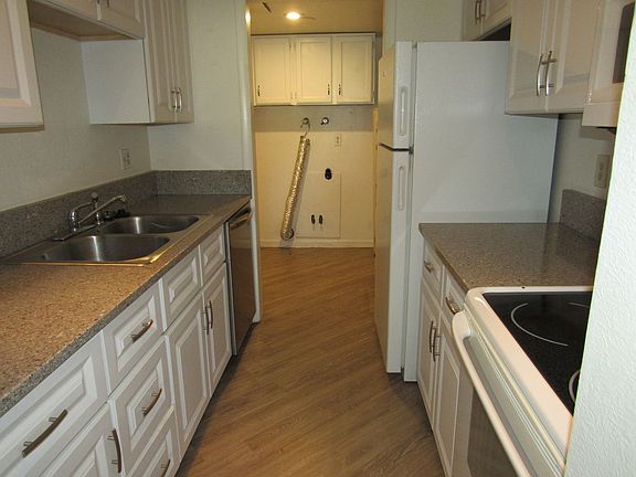 This unit won't last long. 3 bedrooms 1.5 bathrooms, with hard surface flooring on the main level, galley kitchen, washer and dryer hookups in unit. Fenced-in patio, storage closet and covered parking space.