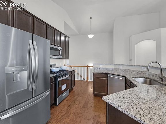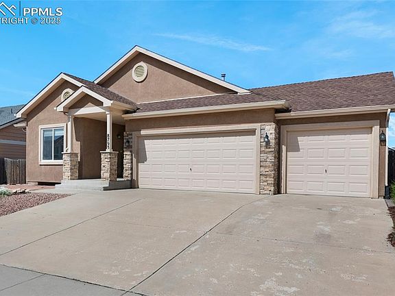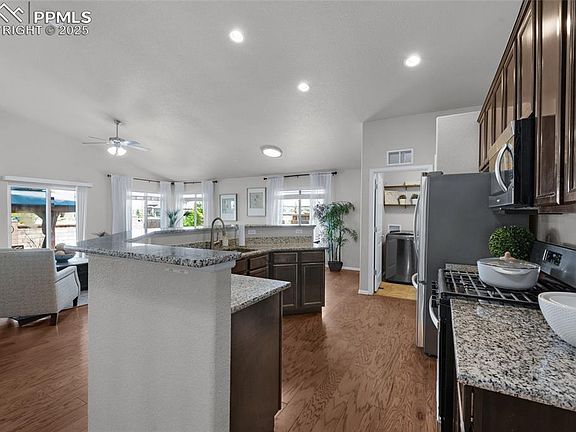 Stunning Ranch Home in Forest Meadows with Mountain Views Welcome to this incredible ranch-style home located in Forest Meadows community. This beautifully maintained property offers a spacious three-car garage and zero-maintenance xeriscaped landscaping in both the front and backyards. Step inside to find hardwood floors throughout much of the main level, creating a warm and inviting atmosphere. The open-concept floor plan seamlessly connects the kitchen, dining, and living room areas, ideal for both daily living and entertaining. The kitchen features granite countertops, a gas range, newer appliances including a refrigerator (refrigerator 2024 and range 2023), and ample cabinet space. The vaulted ceilings in the family room enhance the feeling of space and light, while large windows offer mountain views from the family room, master bedroom, and bath. The spacious primary suite boasts vaulted ceilings, a luxurious five-piece master bath with upgraded granite countertops, a soaking tub, walk-in shower, and a custom walk-in closet system with built-in cabinetry. Two additional main-level bedrooms offer flexibility, with one showcasing a custom wood accent wall. The fully finished basement adds even more livable space, featuring two additional bedrooms, a large office with French doors, a dry bar with granite countertops and custom lighting, and a generous rec/game room with a cozy fireplace—a perfect retreat or gathering space. Enjoy the low-maintenance backyard oasis complete with a pergola ideal for summer entertaining or quiet evenings under the stars. Other features include new carpet (2023) and a humidifier. Don’t miss your chance to own this exceptional home offering comfort, style, and views. Schedule your private showing today!