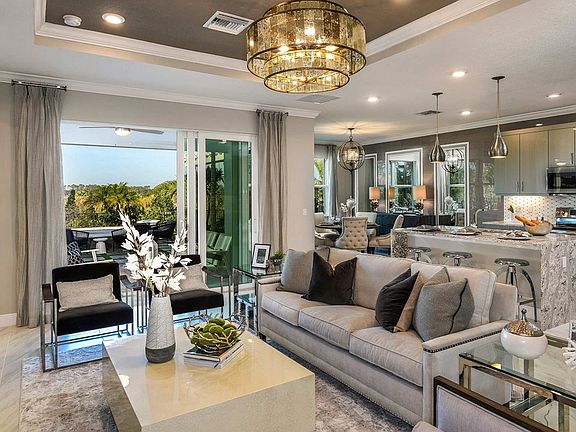 Double doors lead to the den which makes for a great home office or work space. Kitchen offers a large island with Cambria quartz countertops, GE stainless steel appliances and opens to the dining area. Master Suite features double vanities, glass enclosed shower and large walk-in closet. * This Move-In Ready home in Cresswind at PGA Village Verano is located in Port St. Lucie. Some home images may contain additional upgrades, finishes and/or features not included. Floorplan shown is base model and may not include structural options in this home.