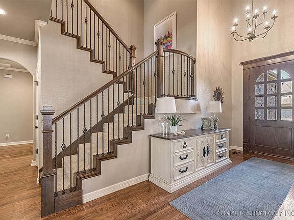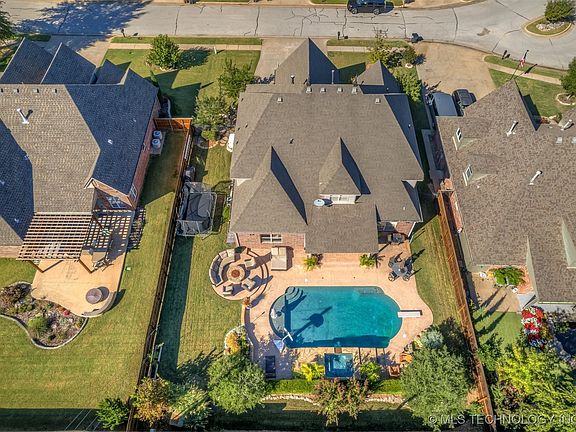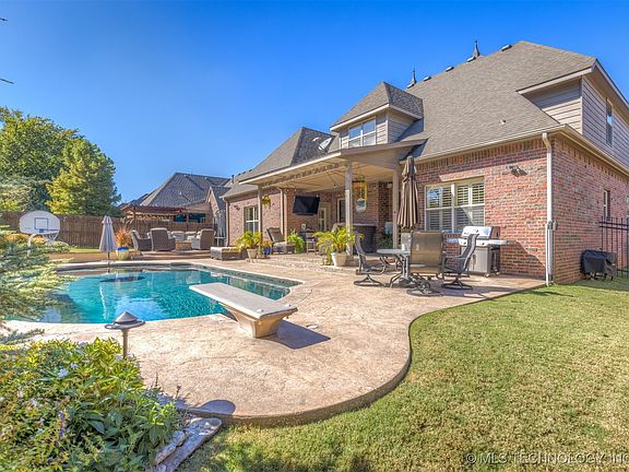 Sleek Modern updated Bixby North home has a stunning outdoor oasis: A brand-new roof will be installed prior to closing! Gunite saltwater pool & hot tub, a beautiful outdoor living space with a firepit & covered patio. Office features custom-made built-ins for a 2-person workspace. Newer built-in added to living as well. Two game rooms one used as a media room with an oversized screen and surround sound and the other as a workout space. 3 bedrooms up and primary located on the first floor. Your eyes are immediately drawn to the gorgeous view of the outdoor living space through any window on the back of the house. The relaxing fountain & bubblers on the pool tanning ledge create a soothing environment. Lush landscaping surrounds the backyard, creating a private escape. Inside, the beautifully remodeled & bright kitchen is the perfect space for entertaining & cooking! Open kitchen and living. Enjoy patio access to the large primary bedroom, with a bright en-suite bathroom & expansive primary closet. Flex room allows for a home gym or additional family room with attic access. It also, includes a spacious 3-car garage, plantation shutters throughout, a sound system inside & out, a laundry room with sink, and a Generac Whole Home generator, WiFi enabled sprinkler system. You can run the system with your phone! Beautiful, friendly, walkable neighborhood with a park & pool make this your next home.