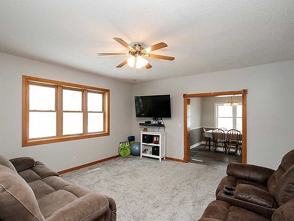 4 bedroom, 2 bath two story home on 6.57 acres. This country property has fruit trees and flower gardens. House has several updates including new AC, furnace and most windows upgraded to vinyl, vinyl siding and a metal roof. 76'x56' machine shed is partially insulated and can be used as an office or workshop. 48'x81' machine shed with a 12'x60' overhang. Both machine sheds have 220 amp electrical service and large shed has water, four exterior water hydrants. Deep double garage is fully insulated and finished, generator at the pole, septic system installed in 2012 and well in 1998. America's Preferred Home Warranty included.
