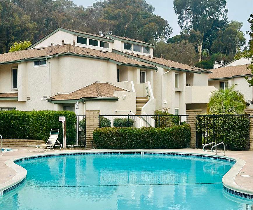Perfectly situated near UCSD, this upstairs La Jolla Terrace residence offers 2 bedrooms and 2 full bathrooms with vaulted ceilings in the living and dining areas. The layout provides privacy between the bedrooms, with the primary suite’s spacious bathroom and walk-in closet creating separation from the second bedroom. The primary suite also features dual vanities, a jetted soaking tub, and a private water closet. From both the primary bedroom and the living room, step out to a private balcony with serene pool views. A sleek black-tiled fireplace adds warmth and character to the living space. The kitchen is finished with granite countertops and stainless-steel appliances, and the laundry is conveniently located in the hall bathroom. The oversized two-car garage is just steps from the entry, with guest parking ideally placed on the balcony side of the building. An excellent opportunity for faculty, professionals, or anyone seeking a well-located La Jolla home close to UTC, shopping, dining, and the best of coastal living.
