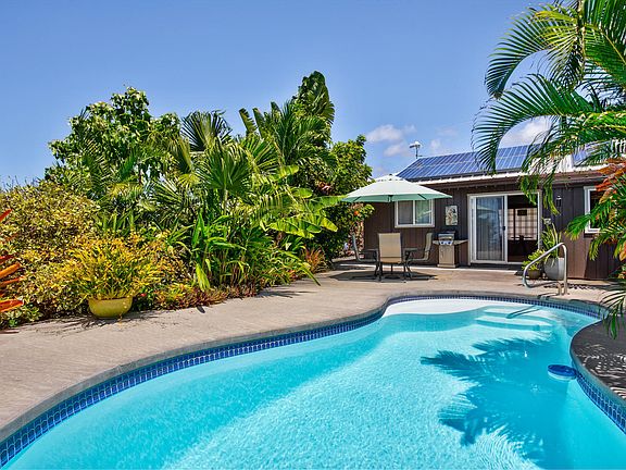 This quintessential South Kona hale offers the coveted freedom of self sustainability, and income generation, yet also, the luxuries of a resort style home. The property sits at a comfortable 1200ft of elevation with big horizon ocean and coastline views. On a clear day from your perch on the slopes of Mauna Loa you can see Hualalai, Kona and the island of Maui beyond. At night enjoy some of the best star gazing in the world and the lights of Kona town in the distance. Its distance from Volcanoes national park, south point, secluded black & green sand beaches, snorkeling, make it an idea home base for tourists or anyone looking to explore and experience the island. The 2 bed 2 bath main house features a large open living area with wood floor, vaulted ceiling, ceiling fan, lots of windows, two sets of French doors leading out to an elevated lanai surrounding all four sides of the house. The kitchen enjoys good storage and workspace with solid wood KraftMaid birch cabinets, quartz countertops, newer stainless steel appliances and a natural slate floor. The master bedroom is very large with a bump-out overlooking the ocean, a walk-in closet and french doors leading to the lanai. The master bathroom is well updated with kohler sinks, brushed nickel faucets and fixtures, and a jacuzzi tub. The studio guest cottage (approx.700 sq. ft.) is operated as a successful vacation rental, listed on VRBO for $120/night, 95% occupancy in the winter, 5-star rated (reviews available upon request). Renovated in 2013 with new paint, flooring, lighting, doors, ceiling fan, air conditioner, furniture, refrigerator and other appliances. The property benefits from state of the art catchment system with UV filtration and new Solar PV system! The San Juan, heated, in-ground pool is a huge bonus as well! Enjoy well established lush tropical gardens with drip irrigation and many of Hawaii's coveted fruits and plants. Come experience this South Kona gem for yourself!