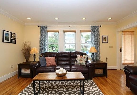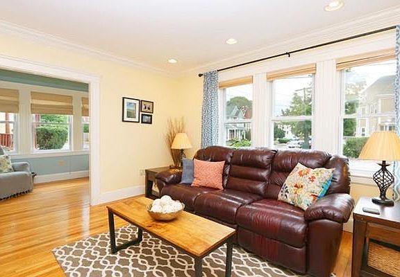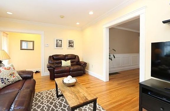 Beautiful 1st floor 2 bedroom condo in move-in condition, this unit is in a great school & commuting location! Walking distance to Peirce elementary school, parks, train, and express Bus. Easy access to mass pike and route 128. Spacious living room that flows into a fantastic sunroom, dining room perfect for entertaining, and hardwood floors through out. Eat in kitchen with granite counter tops and stainless steel appliances. Other amenities include central A/C, in unit laundry, private basement storage room, fenced-in yard and deeded parking.This is a great condo in a super convenient location.
