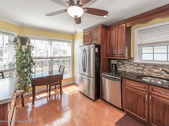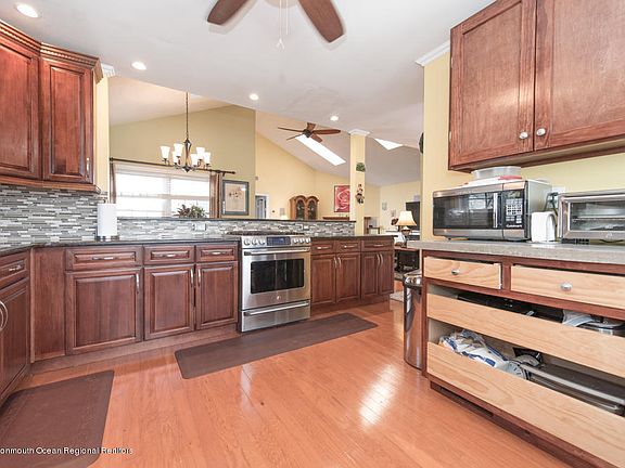 Experience the lifestyle of a gated,.golf course community in sought after Raintree. Newer Eat in Kitchen w/ Cherry cabinets, granite counters, glass & travertine back splash and Stainless appliances! Kitchen wide open to Dining room & Living room both w/ skylights & gleaming hard wood flooring . Living room has vaulted ceilings & wood fireplace. Sliders from Living room lead to very private patio area with awning perfect for BBQ. Large Master bedroom w/ walk in closet & attached master bath. Second Bedroom has slider that leads out to additional patio. Main bath updated w/ granite vanity & seamless glass shower doors. Separate Laundry room, 1 car garage ,Furnace & A/C & HWH 2 years young. Community offers security, pool, tennis and clubhouse. Commuters dream w/ NYC bus at front gate
