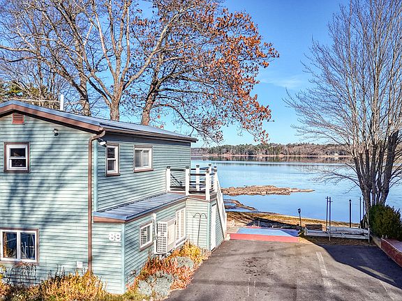 Lakefront living on Sabattus Lake! You are literally almost on the water with this lakeside all year round home! Your firepit is within 20 feet of the water! Sabattus Lake is 1973 acres and is 14.2 miles along the water perimeter. Welcome to Barnard Cove. With 2 bedrooms and 1.5 baths, this stunning property provides incredible versatility-whether you are seeking a full time home, a vacation retreat, an income producing short term rental. Use it as much as you want. Enter through the sunroom that has ten windows and is bathed in natural light overlooking the lake. The open concept living room -dining area is 19.6 by 19.8 with a generous living room, a large open kitchen and a full bath offering plenty of space for everyday living and entertaining. This main level features exposed beams and hardwood floors that add warmth, cabin-like charm along with unique touches throughout that gives this home lots of character. Meticulously arranged furnishings, art, and wall ornamentation is all included with this ready to go home. All that is needed is you! A heat air pump and monitor provide toasty warm and cool atmosphere. The second floor also has a heat-air pump and a living room along with lakeside primary bedroom with sliders to a huge balcony deck overlooking the water. A second outside stairway goes down to the waterfront. Another bedroom has a murphy bed and a half bath is also on this level. Outside the waterfront area has multiple places for you and all to enjoy. A gazebo pavilion provides shade and protection form the elements outside lakeside. There is also an out door patio with pavers and a firepit. The dock system provides plenty of additional room to spread out with stairs also to the water. Plenty of water depth for your boat and swimming. A sandy bottom surface is enjoyed by all. This home is so inexpensive to own. Metal roofs, vinyl siding, reasonable taxes and a whole house on demand generator. Location is ideal and close to everything!