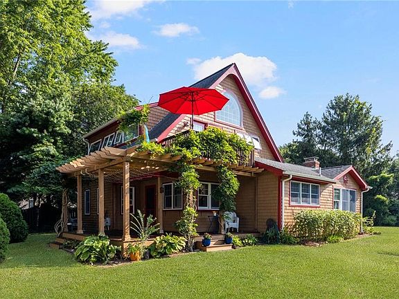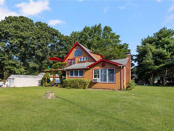 Spacious Cottage set on a triple lot in the Jamestown Shores, with lovely gardens and brilliant sunlight! Stroll down to the water's edge with nearby access on Seaside Drive! This home features a welcoming front porch, an open floorplan, and has a 2 year old updated kitchen, including appliances, and a unique island for casual dining and entertaining. Open to the living room with vaulted ceilings, this sun filled space has a brick fireplace and a woodstove insert from 2018! There is access to the yard through French doors. A dining area, full bath, bedroom, and an additional bedroom presently used as a home office complete this level. The second floor has a generously proportioned primary en suite, with its own balcony and soaring ceilings, an abundance of windows, a large closet, laundry area and full bath. Another room on this level has its own balcony as well. A new 3 BR septic system was installed in June, 2024. A concrete crawlspace for possible storage is home to the 2 year old furnace. Oak floors were refinished this June, along with a good deal of interior and exterior painting. A detached garage is currently used as a workshop, and there is an outbuilding for storage as well. This home has seen additions and improvements over the years and is ready to call home! Possible room for expansion!