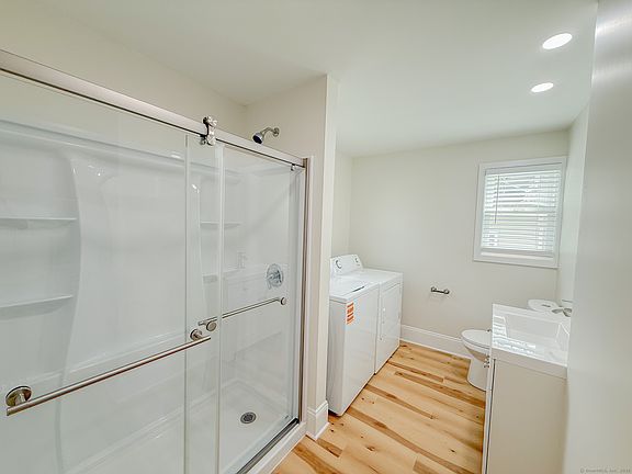 Dedicated laundry roomBlack-finish ceiling fanRefinished hardwood floorsWhite shaker cabinets