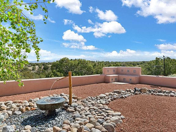 Architecturally designed, Contemporary-style home located in the highly desirable community of La Tierra Nueva. This residence is privately sited on 10 acres surrounded by mature, native pines. Extraordinary views to the Sangre de Cristos and Jemez ranges where the lights of Los Alamos twinkle at night some 30 miles away and sweeping views of the Ortiz and Sandia Mountains to the south. The entry courtyard is defined by rock walls, a flagstone walkway, tranquil water feature and beautiful, landscaped gardens. The residence forms its own village of interconnected sections with descending levels that hug the contour of the land to maximize the views. The home’s passive solar design takes advantage of the site and high desert climate to maximize energy use. Gathering areas of the home include an entry atrium/gallery, chef’s kitchen, dining room and living room. The west wing includes a library/den, guest room, office and a large primary suite w/ meditation/yoga area. The east wing offers a media room/studio or third bedroom ensuite and a workshop with a cedar closet. A generous covered back portal is ideal for entertaining friends or intimate outdoor dining. There are four fireplaces in all. La Tierra Nueva is a gated, equestrian friendly community with a tennis/pickleball court and access to BLM land. It is located approximately 20 minutes from downtown Santa Fe and 15 minutes to the Santa Fe Airport. The Club at Las Campanas is minutes away with social and golf memberships available for purchase and upon approval.
