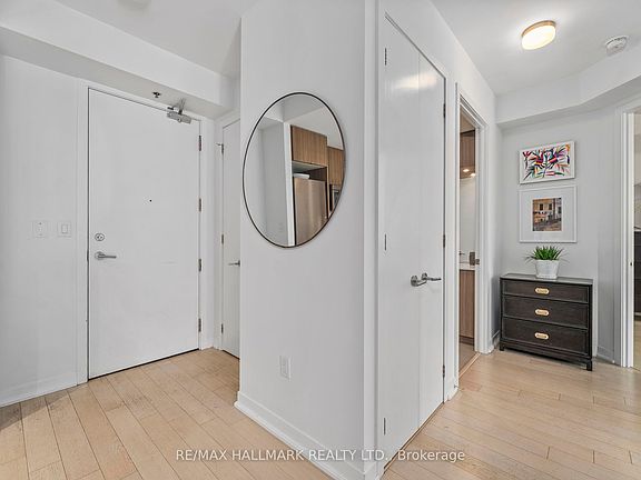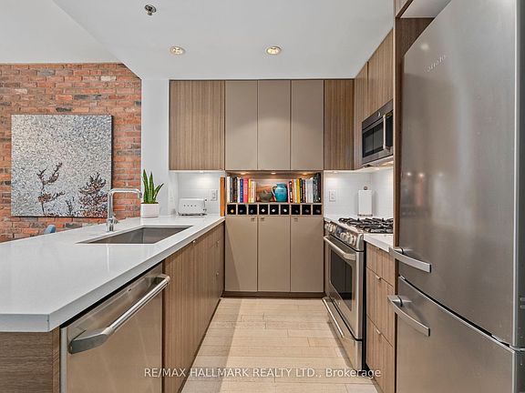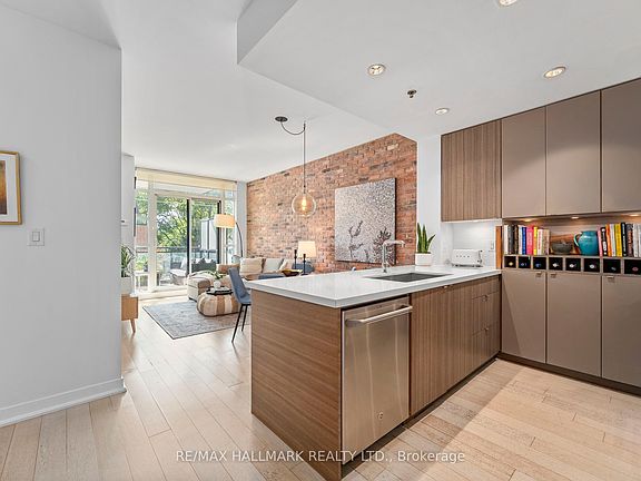 Fabulous "Showcase lofts"! 2 bed, 2 bath gem in the heart of prime Leslieville and the best-priced unit with parking and locker in a long time! This sun-soaked, south-facing suite features a gorgeous exposed brick feature wall, smooth 9ft ceilings, and laminate floors throughout. The open-concept kitchen is equipped with a gas stove, white stone countertops, an undermounted oversized sink and ample storage making it as functional as it is stylish.Enjoy beautiful treetop views and an oversized balcony with electrical outlets! Perfect for al fresco dining on warm summer nights. Spacious primary suite with his & hers closets, a luxurious 4-piece ensuite featuring a deep soaker tub, plus a second bedroom and an additional modern 3-piece bath with a glass shower enclosure. Theres also a convenient front entry storage area and coat closet. Building amenities are second to none, enjoy a world-class gym, party room, 24 security, bbqs in the back courtyard and more. Just steps from the best part of Queen St E, youre in the beating heart of Leslieville with shops, cafés, restaurants, and transit at your doorstep.