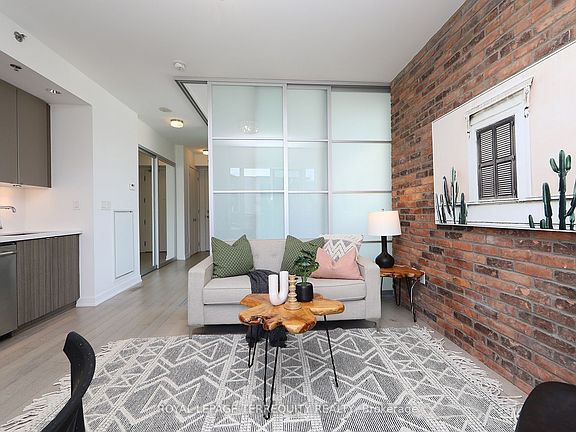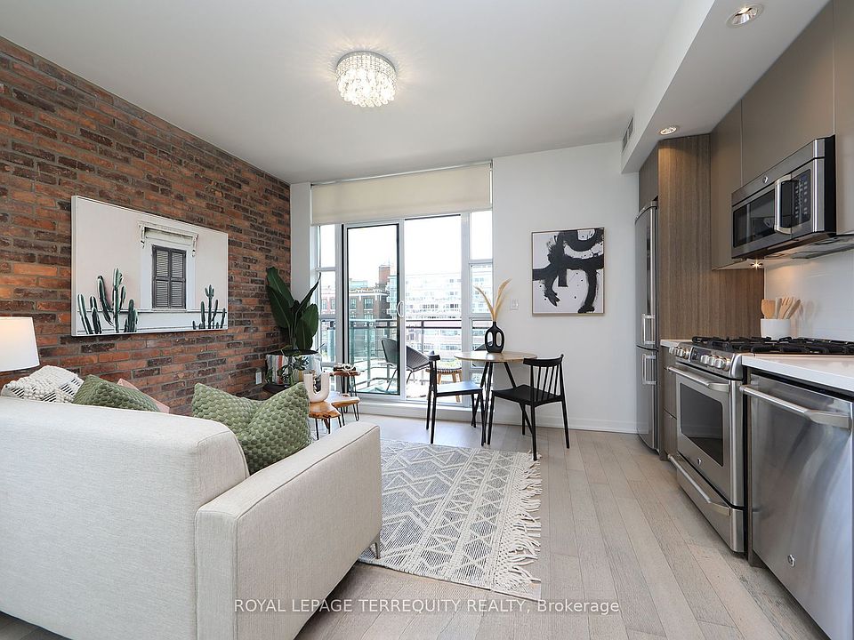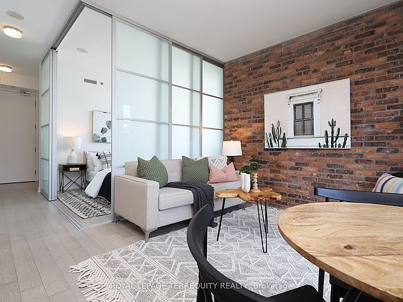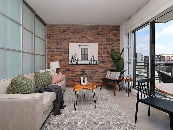 A rare find in the heart of Leslieville - this 1-bedroom corner suite wraps you in light from two exposures, north & east, thanks to an exclusive builder upgrade. At just the right height above the street, you'll feel the city's pulse yet enjoy your own quiet escape. Soaring 9-ft ceilings, a striking brick feature wall, and sleek stone counters set the stage for a home that's as stylish as it is comfortable. Sliding glass doors frame the bedroom, where a rare, large window floods the space with light - balanced by blackout blinds for those slow, indulgent weekends. Step onto your large, private balcony (with power) and watch the neighborhood wake up. This suite includes a deeded parking spot, storage locker, and a bike storage locker - because life here calls for cycling to the market or down the Don Valley trails. The building's boutique charm comes with big amenities: a rooftop deck for sunset cocktails, a well-equipped gym, guest suites, concierge service, party room, theatre room, and visitor parking. Outside your door, Queen Street East buzzes with some of the city's best cafes, bars, and boutiques. Ascari, Crows Theatre, John Chang Park, and Jimmy Simpson Park are steps away, while the DVP and transit make Downtown or the Danforth feel impossibly close. This isn't just a home - its a front-row seat to the best of Toronto's east side. Stylish, effortless, and ready for your next chapter.