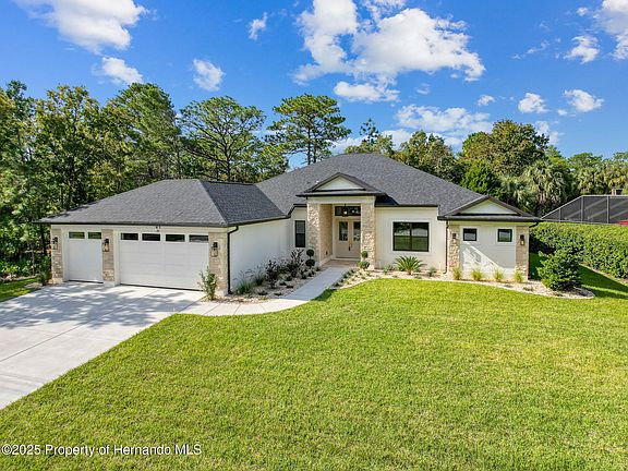 Modern Elegance Meets Timeless Luxury! Welcome to the Millwood, crafted by Joseph W. Mazzuco Signature Homes. Step into a world of refined sophistication with this brand-new luxury home, where every detail has been meticulously curated to elevate your lifestyle. From the moment you enter, you're greeted by soaring ceilings, expansive windows, and a seamless blend of contemporary architecture and professional designer finishes. The gourmet chef's kitchen is a showstopper, featuring caviar-colored custom cabinetry, quartz countertops, a spacious pantry with custom cabinetry and a premium stainless steel Frigidaire appliance package that combines sleek design with exceptional performance. The open-concept living and dining areas are adorned with diagonal white oak plank tile flooring, ambient lighting, and striking designer accent walls in the dining room and great room - adding texture, warmth, and architectural interest. Throughout the home, designer-selected fixtures and finishes—including brushed gold hardware and statement lighting—infuse each space with elegance and personality. The spa-inspired primary suite offers a freestanding soaking tub, an oversized walk-in shower, and quartz counter tops with dual vanities, creating a serene retreat to unwind at the end of the day. The dual closets feature professional custom cabinetry and organizers, combining luxury with everyday practicality. The grand laundry room is thoughtfully designed with built-in cabinets, quartz counter tops, storage shelving, and a mud sink, making household tasks both stylish and efficient. A Samsung washer and dryer set is also included, elevating your laundry experience to match the refined ambiance of the home. Crafted by Joseph W. Mazzuco Signature Homes, renowned for their unwavering commitment to excellence, this home is the embodiment of trust, craftsmanship, and luxury. With a legacy rooted in integrity and innovation, this Builder approaches each project with a meticulous eye for detail and a passion for creating spaces that inspire. Every element—from the structural foundation to the finishing touches—reflects their dedication to quality and their belief that a home should be as enduring as it is beautiful. This is more than just a residence; it's a testament to a builder who understands that true luxury lies not only in high-end finishes, but in the peace of mind that comes from knowing your home was built with care, precision, and purpose. This is more than just a place to live—it's a statement of style and substance. Whether you're hosting elegant soirées or enjoying quiet evenings watching nature from your covered patio, this home offers the perfect backdrop for your next chapter. Sugarmill Woods Oak Village is a well-established, deed-restricted community in Homosassa, Florida, known for its mature oak trees, lush green space, and a welcoming neighborhood atmosphere. With an abundance of greenbelt spaces throughout, Sugarmill Woods reflects an awareness of environmental and ecological concerns. Land use is warranted in deed covenant, assuring the community of the preservation of native flora and fauna. Government preserves to the east and west shelter the area from excessive future development.