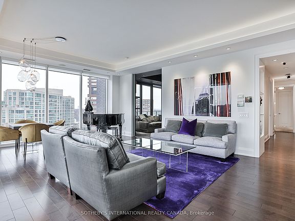 Welcome to The Florian, an ultra-exclusive residence offering unparalleled luxury and sophistication in one of Toronto's most sought after locations. Step inside this remarkable space and be wowed by the high-end finishes and custom details throughout. Totalling almost 2,200 square feet of interior space, this sublime unit also boasts over 450 square feet of exterior space. The chef's dream gourmet eatin kitchen features custom cabinetry, state of the art appliances, a large centre island and designer backsplash. The expansive open-plan living room / dining room with 10' ceilings and hardwood flooring through out is perfect for entertaining and relaxation. The sumptuous principal suite has a private terrace and a huge custom-built walk in closet. The marble-floored ensuite enjoys a separate water closet, spa-style shower, and extra deep soaker tub. The second large bedroom is an ideal office space with its own upgraded ensuite. The den/office/third bedroom is replete with custom finishes and hidden pocket door for added privacy. Walk out to oversized terraces with panoramic views from every room. Floor-to-ceiling windows allow for natural sunlight and jaw-dropping unobstructed views of the city. Two side-by-side parking spots and an oversized locker next to the spots are also included. The Florian features world class amenities including 5 star concierge services, valet parking for both residents and guests, and a stunning swimming pool and award-winning fitness center. This striking Yorkville landmark building is steps to high end shopping, fine dining, cultural attractions and more, making it perfectly positioned for those seeking a life style of convenience and elegance. Do not miss this beauty!! **EXTRAS** Miele fridge/freezer: S/S double oven; S/S Microwave: inductiongas cooktop; Dishwasher; Faber S/S hood fan; LG Washer & Dryer :Rosie; 2 bar fridges.