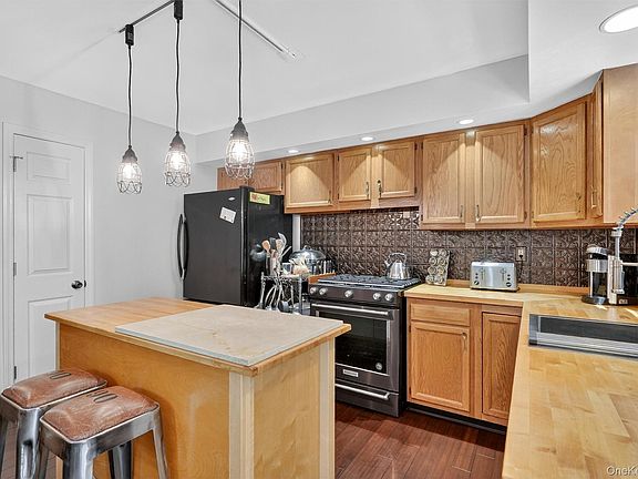 The main level features a spacious sun-filled living room that flows seamlessly into the beautifully eat-in kitchen, complete with maple cabinetry, warm wood countertops, and high end appliances, and a center island that serves as both a prep space and a casual gathering spot. Sliding glass doors lead to a private deck, where you can relax with your morning coffee or enjoy quiet afternoons outdoors. A powder room completes the first floor.