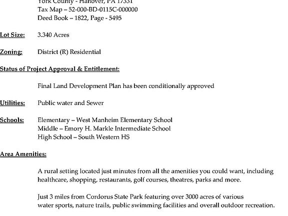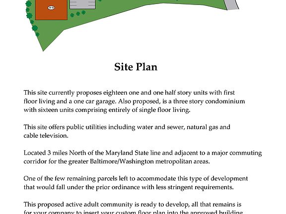 PRICE REDUCED - Land parcel ready for development. ENGINEERED and conditionally APPROVED for condensed housing residential development, multi-townhouse community or 55+ active senior community. Containing 34 Units. Detailed engineering drawings, infrastructure costing and associated details are available. ONE OF THE FEW REMAINING PARCELS left TO ACCOMMODATE THIS TYPE OF DEVELOPMENT that would fall under the prior ordinance with less stringent requirements, providing a significate COST SAVINGS. Located in Hanover PA, 3 miles from Maryland line and positioned in a COMMUTING CORRIDOR for the greater Baltimore/Washington metropolitan areas. This site offers public utilities including water and sewer, natural gas and cable television. A rural setting located just minutes from all the amenities you could want, including healthcare, shopping, restaurants, golf courses, theatres, parks, and more (ie Super Walmart, Giant, Starbucks, Codorus State Park - see comprehensive list in pdf brochure). Just 3 miles from Codorus State Park featuring over 3000 acres of various water sports, nature trails, public swimming facilities and overall outdoor recreation. With its close proximity to Gettysburg, Baltimore and Washington DC, this condensed townhome or over 55 community in Hanover, Pennsylvania offers a centralized location to a vast array of amenities catering to the active adult or family lifestyle. This proposed condensed residential community is ready to develop, all that remains is for your company to insert your custom floor plan into the approved building footprints and away you go. SEE ATTACHED PDF's FOR MORE DETAILS.
