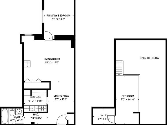 Two-level duplex layout main floor with king-size primary bedroom, upper loft bedroom/home office with walk-in closet