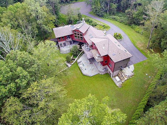 Architecturally significant modern home, influenced by the works of Frank Lloyd Wright & Philip Johnson, nestled privately on 2 acres at the end of a cul de sac in sought after West Mountain Estates w/recreational assoc. for pool, tennis, basketball, ball fields, pavillion & neighborhood social events. This true work of art is the result of a $2M+ gut renovation & expansion of the original home, inspired by its unique setting, perched over a running brook. In keeping with true modernist architecture, the house unfolds into it's serene backdrop with more than 100 picture windows, skylights, multiple balconies & terraces, plus the delight of a brook that runs beneath the 22' great room, visible through a built-in, see through glass coffee table. The sounds & sights of the natural environment abound. Environmentally sensitive & efficient materials are used throughout. This home is both expansive & intimate, incorporating over 5,000sf with wide open living & dining areas, state of the art chef's kitchen, 4 car garage, & 4 distinct bedroom/lifestyle "wings" - ideal for multi-generational use, work, studio or fitness, complete with 3 laundry rooms. There's a main level primary suite option, or another ensuite option on the 2nd floor w/adjoining sitting/media room plus additional nursery/BR. Two dramatic staircases lead to the two separate lower levels: one with luxe studio including LR, BR, full bath & kitchenette; & the other w/full bath, kitchenette, BR/office & glass yoga room! Owner's vision & project overview: By the end of the project in December 2021, the entire house had been completely rebuilt inside & out. The brook was beautifully contained in a hand-built structure with pools and waterfalls & deep enough to hold the thrilling rush of the biggest rainstorms. The wood patios were replaced with bluestone & Ipe hanging decks, high above the backyard woodlands outside of the two master suites, & off of the new kitchen. Three new kitchenettes were installed: in the new upstairs suite, caregiver suite, and downstairs gym & craft rooms. Three laundries were built for privacy & ease of use. The main floor kitchen gained a 12-foot center island with a sink, dishwashers, storage & seating for endless cooking & entertaining. The whole house flooring was thoughtfully replaced with mahogany-stained Asian walnut, as well as sophisticated tiling & epoxy garage flooring. The exterior lost its old school stucco, replaced by 3-D printed aluminum siding & stone. The entire house, from basement to rooftop was completely rebuilt for beauty & ease of living. In gently redesigning the existing footprint, the house walls were replaced wherever possible with large Thermopane windows -ultimately more than 100 - & more than 20 skylights added to allow in the maximum amount of light & outdoor viewing. Oil heating was replaced with propane & brand-new highest technology whole house systems. The house has all new electrical & all new plumbing. The infrastructure for future solar panel leasing or ownership is already in place. The lighting & appliances are all brand new & energy efficient. Landscaping: The house is surrounded by native hardwoods including three types of Hickories, majestic old Oaks, Silver Maples, two Dogwood species, Elm, Birch, Willows, White Ash, & Sweet Birch. Planted additions include: boxwoods, Mountain Laurel, Japanese Andromeda, native Rhododendrons, Lilac and Azalea. The owner has curated wildflowers to benefit pollinators & native birds. Local native plants include St. John's Wort, Jewelweed, Queen Anne's Lace, Wild Geranium, sunflowers, & a variety of squashes. In early spring, edible wild ramps proliferate. In July, Wineberries (wild raspberries) ripen in such profusion that an enterprising jam lover can stock up for a year of homemade jam gift giving or leave them on the vine for the birds of summer.