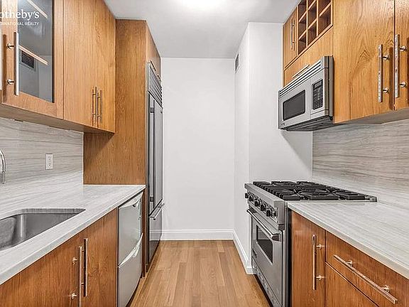 The chef's galley kitchen is a modern and efficient space, featuring custom cabinetry, sleek high-end countertops, and high-end stainless-steel appliances including a stove, microwave, Subzero refrigerator, and two-drawer dishwasher.
