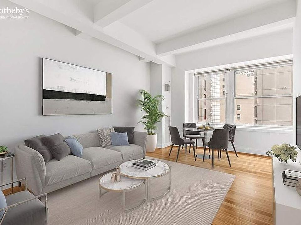 This spacious loft-like design studio with home office, features high beamed ceilings, gleaming wood flooring, and oversized windows.