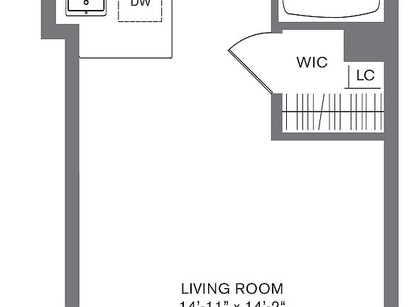 Oversized studio apartment featuring floor-to-ceiling windows, high ceilings, a gourmet kitchen with stainless steel appliances, honed concrete tile floors, granite countertops and an eating bar. Apartment also contains high ceilings, wood floors throughout and a modern bath with custom stainless steel vanity and marble tile floors.