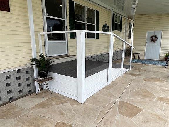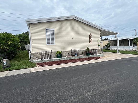 Palm Hill Country Club is a highly regarded 55+ gated community offering an opportunity to own a rare three-bedroom, two-bathroom residence spanning 1,296 square feet, located in the pet-friendly section where one small pet is permitted, making it an ideal choice for animal lovers. For a monthly maintenance fee of $554.00, residents enjoy a comprehensive package of services that enhance ease of living. The fee covers water, sewer, garbage collection, lawn care, cable, and internet services, ensuring that essential needs are met with minimal hassle. This community offers an impressive range of amenities designed to promote an active and engaging lifestyle. Residents have access to a nine-hole golf course, a welcoming clubhouse, three swimming pools, and two relaxing jacuzzis. Additional recreational options include tennis courts, shuffleboard, billiards, horseshoes, pickle ball, and other facilities, all contributing to a rich community experience. INTERIOR: Step inside this spacious three-bedroom, two-bath split-plan open floor plan home and discover a layout designed for both comfort and functionality. The home offers enhanced accessibility with a ramp providing easy entry. Interior finishes feature fashionably colored wallboard throughout, laminate flooring in the main living areas, with furnishings being part-optional. Central heat and air, replaced in 2015, along with ceiling ducts and ceiling fans, delivers dependable comfort across the seasons. Highlights include an expansive eat-in kitchen with plentiful storage, vinyl flooring, complemented with a washer and dryer tucked neatly behind doors, along with a full suite of appliances—fridge, range, oven, dishwasher, disposal, and microwave. A substantial dining room provides all the space you need for large gatherings and opens into a massive living room, perfect for entertaining guests. The magnificent primary bedroom is generously sized, has a closet for storage, and includes an en suite bath with a walk-in shower, double vanity, tons of space for storage, and tile flooring. Two additional bedrooms provide flexibility—one ideal for hosting visitors and the other easily serving as an office, den, or additional guest space. A second, pristine bathroom with a tub-shower combination and laminate flooring that flows from the hallway to the bath truly improves the home’s functionality. EXTERIOR: The exterior of this residence is designed for both appeal and practicality, featuring low-maintenance vinyl siding and a contemporary designer driveway that leads to an extended carport, newly installed in 2025. The property also includes a durable roof-over updated in 2017, providing long-term value and security. No rear neighbors sweeten the deal by ensuring privacy. A beneficial shed offers ample storage space for tools, seasonal belongings, or hobbies, ensuring organization and ease of access. Offered at $185,000 with a share, this residence delivers value, lifestyle, and location into an opportunity that is as rewarding as it is inviting!