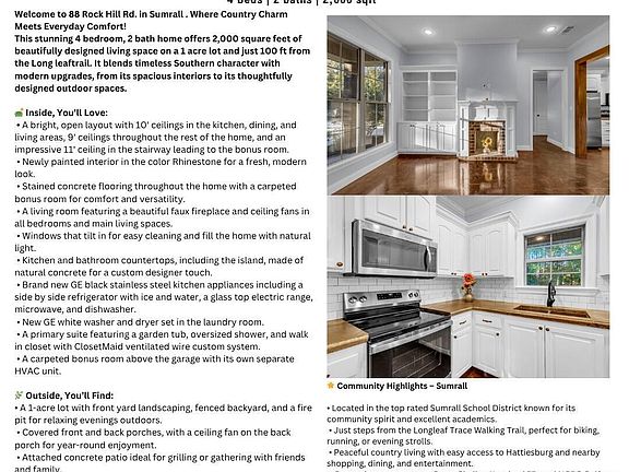 Welcome home to 88 Rock Hill Rd in Sumrall, where timeless country elegance meets effortless modern living. Nestled on a peaceful 1 acre lot surrounded by nature and just steps from the Longleaf Trace walking trail, this home offers the perfect blend of space, serenity, and sophistication for those who value comfort, connection, and a touch of Southern grace.