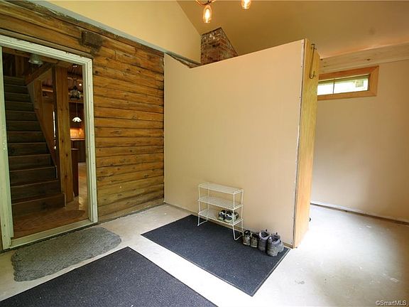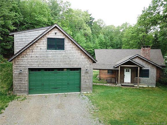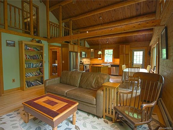 Perfectly Situated on 5.7 Private Acres, This Log home is complete with an oversize 4 car garage with additional loft above with over 1000sf makes for a perfect workshop, studio or possibly a home office if finished! An open floor plan allows the wood stove to heat the entire house maximizing the efficiency. An amazing eat-in kitchen space with a farmers sink, center island custom cabinetry and granite tops is open to the living room where you will find a unique mantle compliments the floor to ceiling brick chimney and woodstove! 2 bedrooms on main level and a remodeled bath with dual sinks, tub/shower combo with tile surround, 3rd bedroom/office on upper level with lots of closets and attic storage. Wooded and Private, your retreat in the woods is just minutes to UConn and I-84 for an easy commute to Hartford. Just 75 Minutes to Boston and 2.5 hours to NYC. What a great place to enjoy the lifestyle you've been looking for.