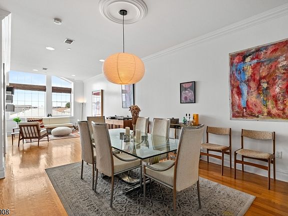 THIS PROPERTY QUALIFIES FOR A 30 YEAR FIXED RATE AT 5.125%/5.18% APR WITH 5% DOWN AND NO PMI. Welcome to this stunning light and bright well-maintained 2-bedroom, 2-bathroom luxury condominium in the highly sought-after Ironbound neighborhood. This top-floor LARGEST unit offers 1180 square feet of generously sized living space and is ready for immediate occupancy. Its open floor plan encompasses a modern kitchen with stainless steel appliances and a substantial breakfast bar, a contemporary dining room, and an elegant living room, creating an ideal setting for hosting guests. Expansive bay windows allow for an abundance of natural light and provide views of the surrounding cityscape. Further enhancing the appeal are 9-foot ceilings, crown molding, central air conditioning, an in-unit washer and dryer, two well-proportioned bathrooms and bedrooms (including one en suite), and pristine hardwood floors throughout. A secure ground-level garage includes One Assigned Parking Space, a 5x7 storage space, and Garage Door Opener. Amenities include an intercom and Elevator. Association Fee covers Common Area Maintenance, Exterior Maintenance, Sewer Fees, Snow Removal, Trash Collection, Water Fees. Conveniently located within less than 1/2 mile to Newark Penn Station into NYC and EWR International Airport. Easy access to Major Highways, Shopping, Restaurants, and Much More!