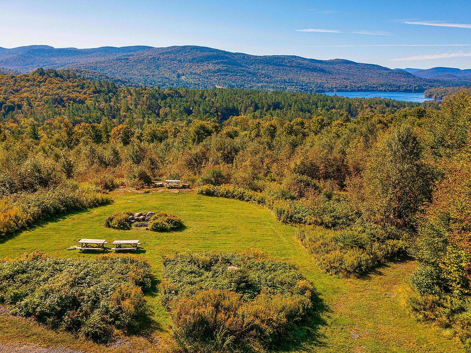 The lawn area is landscaped in a way that allows for seasonal wildflowers to arise, while also offering a flat and expanded lawn space for family gatherings and enjoyment. The large handcrafted stone fire pit is a central piece of the property and looks out onto the awestriking view. This is most exciting during the Town of Long Lake's firework celebrations where you can watch from your own personal vantage point.